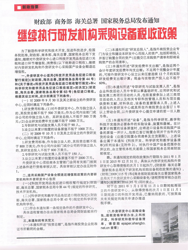 财政部、商务部、海关总署、国税局《继续执行研发机构采购设备税收政策》